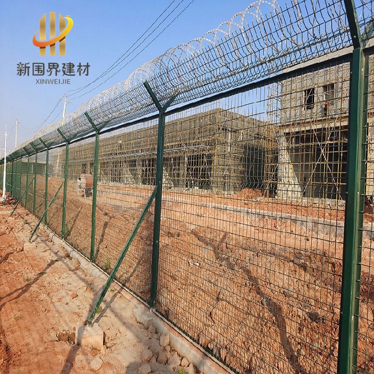 主体结构高度标准一般为2.5米,增设0.5米滚笼或蛇腹型刀刺网等防攀爬设施。网片材质采用冷拔镀锌钢丝焊接,网格尺寸多为100*50mm,表面经过热镀锌、PVC涂层等防腐处理。边框为角钢40*40*5mm或50*50*5mm,立柱中心距一般为3米,立柱为Y型立柱,60*60mm或60*80mm矩形钢管,底部连接钢筋混凝土地梁(如24*30cm规格),增强整体稳定性。顶部配置V型支架及刺刀圈,结合卡扣固定,显著提升防翻越能力。沿围界每150米设置夜间可视警告标识,并配备斜撑、转角钢板等加固结构。